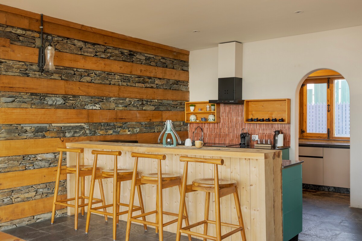 A warm, design-forward Himalayan villa made for unhurried days and quiet luxury. The 2-bedroom unit crowns the second floor of the 6-bedroom home, offering private verandahs, panoramic valley views, and sunlight-filled rooms crafted for relaxation. Guests share the living and dining spaces, glass conservatory, and lounge with pool table — perfect for an intimate mountain escape. Can be combined with the 4-bedroom unit below for larger gatherings.