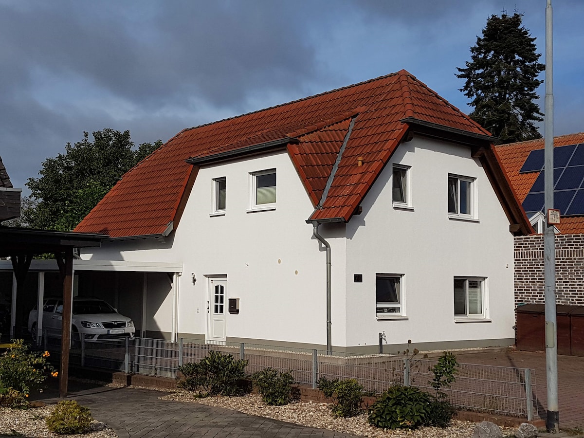 Oublie tes soucis dans ce logement spacieux et calme. Dans la maison de 152 m² entièrement modernisée en 2015 et constamment embellie, jusqu'à 8 personnes plus 2 bébés ont suffisamment d'espace, la maison est équipée d'un chauffage par le sol, d'une cuisine de haute qualité, d'une buanderie, d'un lave-linge, d'un sèche-linge, de 2 salles de bains, 1x douche et 1x douche et baignoire. 3 chambres à coucher, chacune avec 1 télévision. Wifi. Grand salon/salle à manger, cuisine ouverte, salon avec cheminée. Un beau jardin, des plantes denses pour la protection de la vie privée, une terrasse couverte.