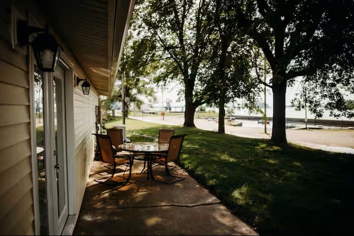 Firepit ready for relaxing nights by the river. Kayaks included for warm days Wake up to sweeping Rock River views, sip coffee on the wrap-around deck, paddle out in the kayaks, and end your evening by the firepit as the sky glows at sunset. This eclectic riverfront bungalow blends vibrant décor with cozy comfort and seamless indoor-outdoor living. Perfect for girls’ weekends, fishing trips, romantic escapes, or peaceful fall getaways — just steps from the water and minutes to shops and dining