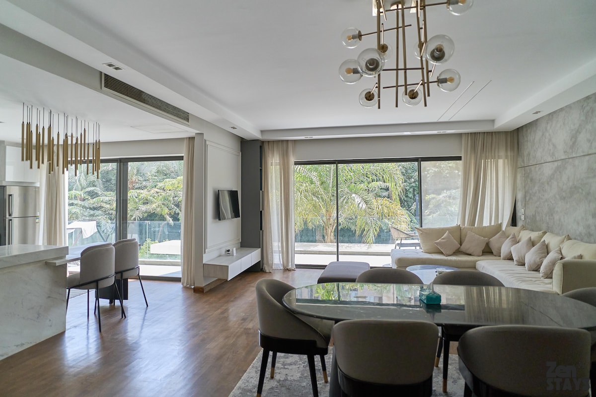 Notre penthouse moderne avec piscine privée est parfait pour les familles à la recherche de commodité et de luxe. Situé dans une communauté fermée dans le quartier chic de New Cairo, à seulement 30 minutes de l'aéroport, et à proximité de commodités comme KFC, Starbucks et une variété de restaurants occidentaux et locaux (Chili's, Fuddruckers, LongHorn Texas, Ibn Al Sham). Des équipements tels qu'un lit King Size, un lave-linge, un sèche-linge, un lave-vaisselle et un micro-ondes assurent le confort, et 4 téléviseurs intelligents offrent des divertissements.