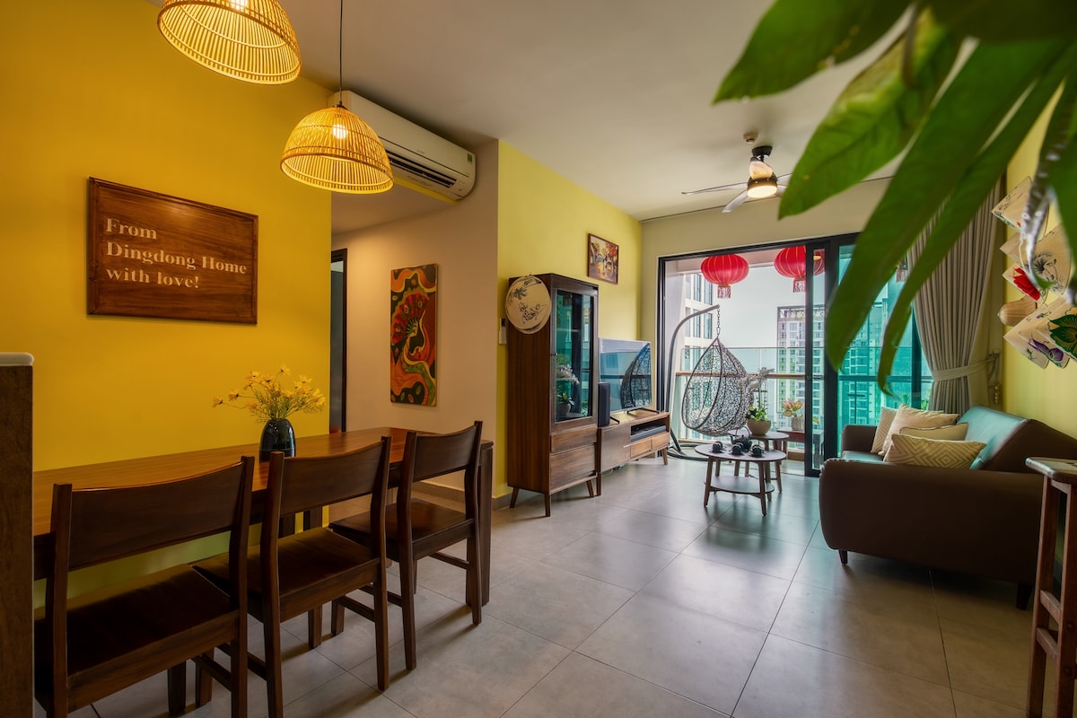 Spacious and cozy 2-bedroom apartment. Fully equipped for a family, TV equipped with Netflix, dining room, kitchen with full utensils, washing machine, dryer... Free all 5-star amenities: gym, swimming pool, zacuzzi, sauna.... Suitable for long-term travel or business trips It only takes 15 minutes to get to District 1. Free airport pick-up when staying over 10 days.