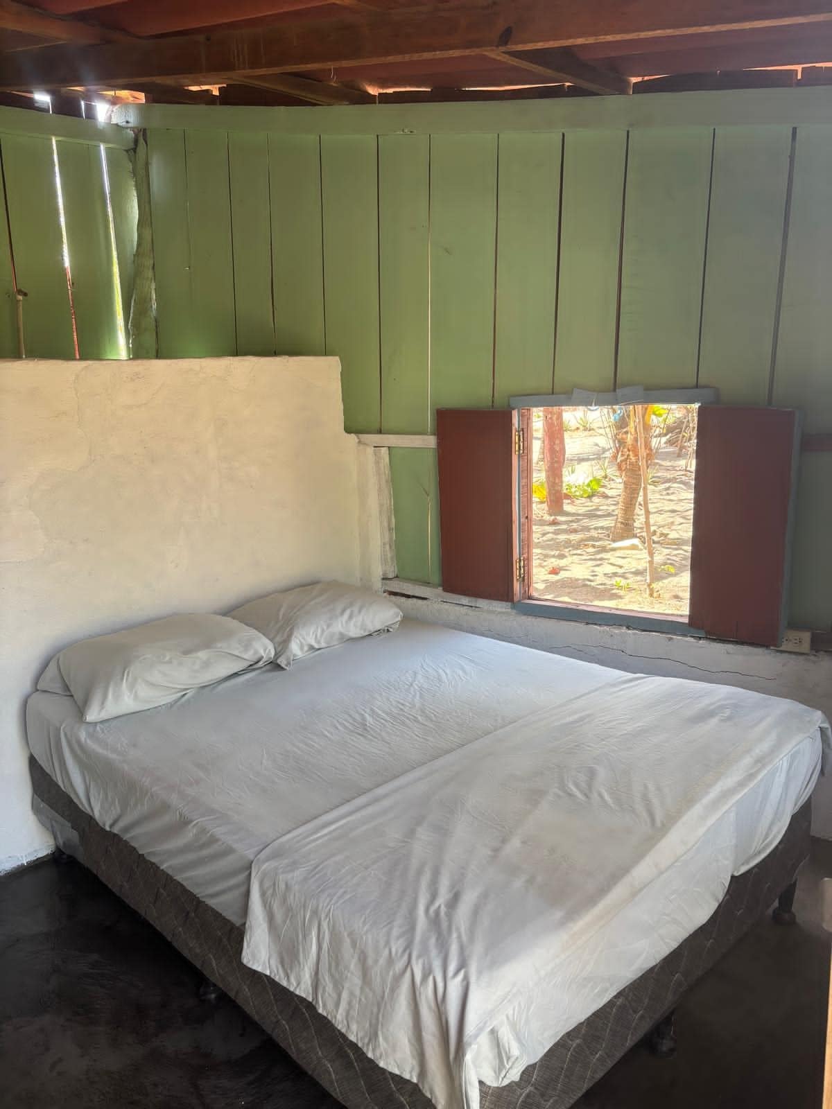 Es una habitación privada con ventilador y baño compartido en un segundo piso, fuera de la habitación hay una terraza compartida con vista al lago y también desde aquí puedes ver los dos volcanes, y dependiendo del clima un atardecer increíble, también tiene hamacas compartida y una pequeña cocina en el piso de abajo compartido que pueden utilizar, también wifi dentro del habitación.