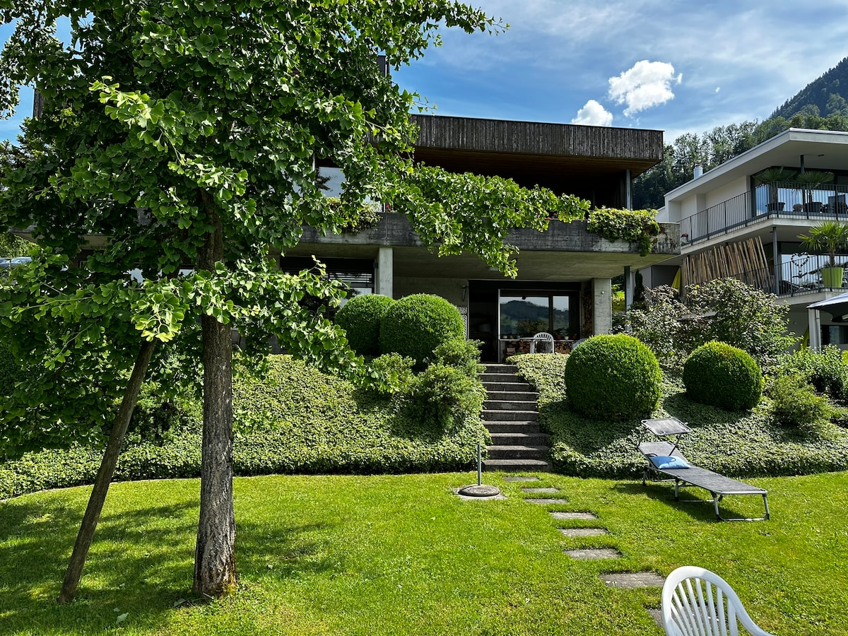 Suite privée au sommet de la villa habitée des propriétaires avec accès au lac et vue unique sur les Alpes. La plupart des points forts sont accessibles en moins d'une heure. Aménagement : chambre spacieuse (avec home cinéma), salon panoramique attenant, grande cuisine, salle de bain, tous à usage privé. Pour une occupation de 3 à 5 personnes, une autre chambre/salle de bain privée (étage inférieur, accès par ascenseur) est fournie. Accès au lac et au jardin. Parking gratuit/wifi. Les enfants sont possibles, petits chiens seulement. L'Airbnb le plus populaire de Suisse.