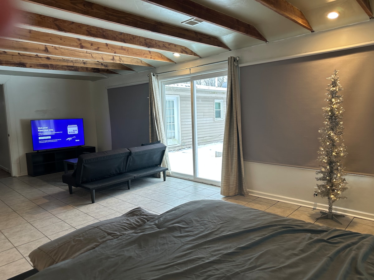 Kick back and relax in this converted studio style private unit in Howland twp. between city of warren and cortland private space an addition to the main private house. freshly renovated and features : queen size bed (soft hybrid mattress) / shower panel / small kitchenette (small fridge and microwave) / 2 seating spots " living room " with a 65" smart TV / 2 seating spot " dining area" / WiFi / free standing A/C ( not connected to the house so you can control desired