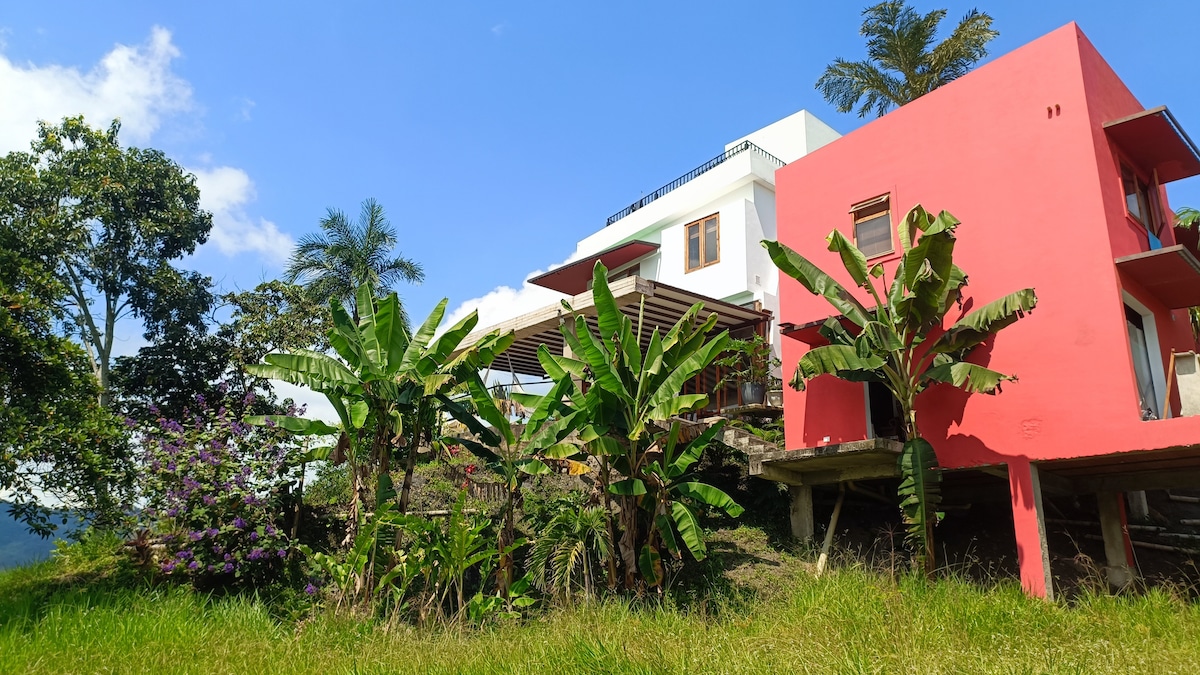 « Suite entre les arbres », conçue par l'artiste Denis Aleksandrov. Lit queen size, espace social, cuisine équipée. À 1700 mètres, au sommet de la colline, la maison d'auteur offre une vue panoramique sur El Tablazo et les vallées de San Francisco, La Vega et Gualivá. Avec un peu de chance, vous pourrez apercevoir le parc de Los Nevados et la fumée du volcan Nevado del Ruiz. Climat chaud et nuits fraîches et sans moustiques.