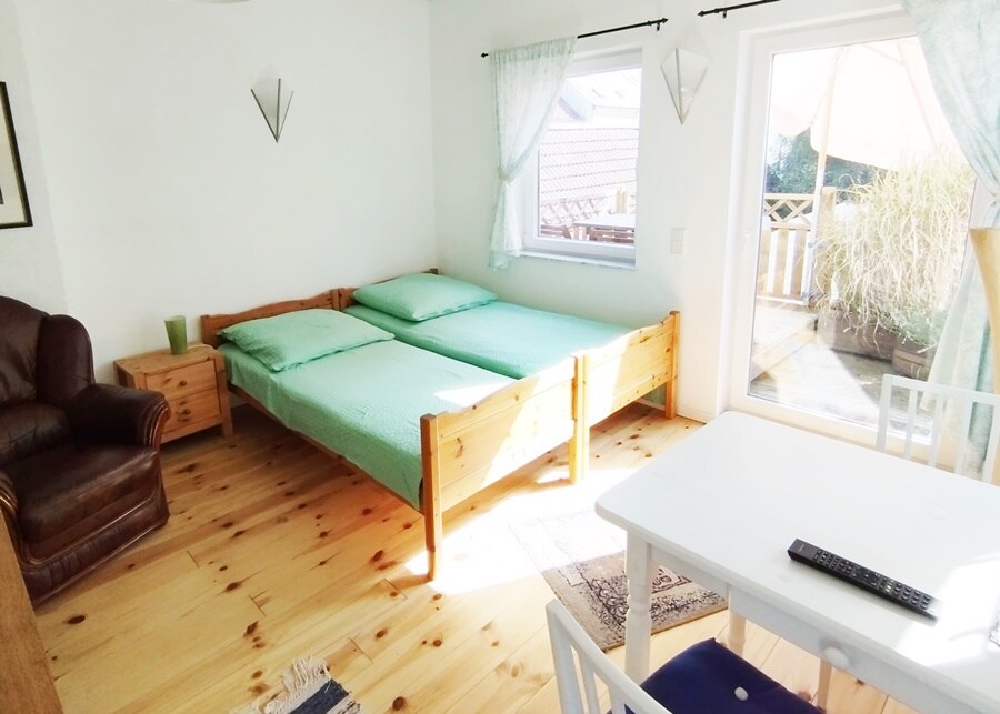 Dans notre immeuble, nous ne louons que l'appartement de vacances à l'étage. Vous accédez par un escalier à l'entrée séparée de l'étage supérieur de notre maison, où vous trouverez un grand salon et salle à manger combinés, une chambre à coucher séparée ainsi qu'une salle de bain avec WC et douche. La taille de l'appartement est d'environ 50 m².