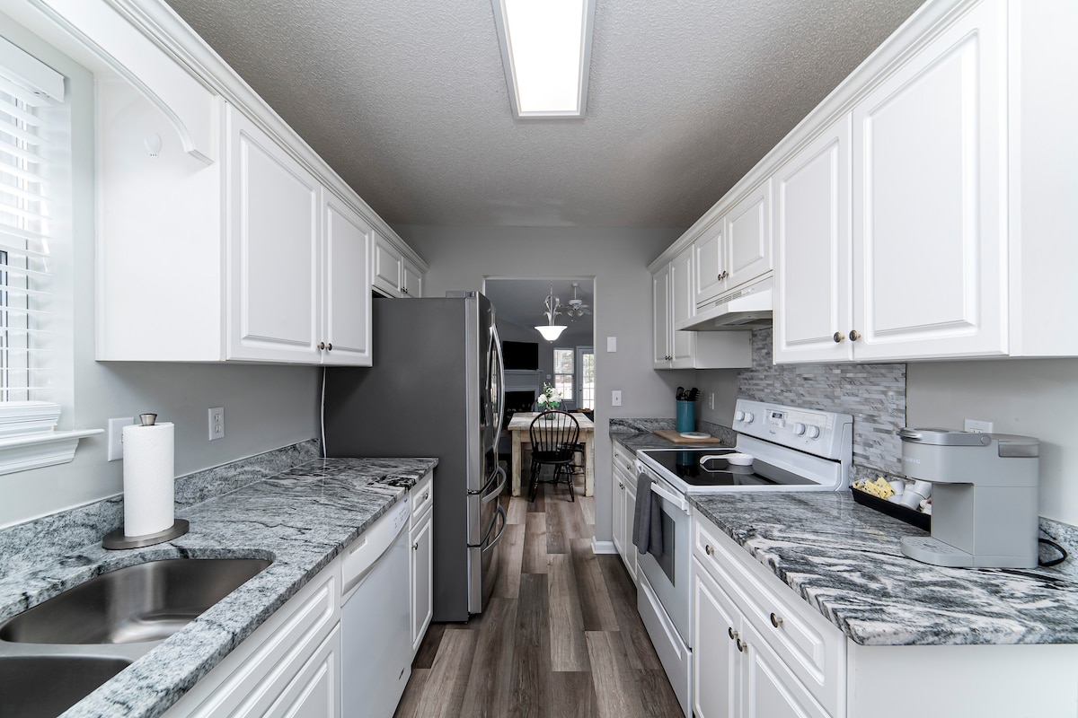Maison de 4 chambres magnifiquement conçue à seulement 5 miles du centre-ville d'Augusta. La qualité de l'ameublement et des équipements offre une expérience haut de gamme avec une touche du Sud. Profitez de votre café du matin dans notre patio arrière. Détendez-vous pendant la journée et diffusez votre émission préférée sur n'importe quelle télévision sans interruption avec notre connexion Wi-Fi de plus de 300 Mbps. Détendez-vous ensuite en famille et regardez un film après un repas fait maison sur la télévision 65" du salon, avant de vous coucher.