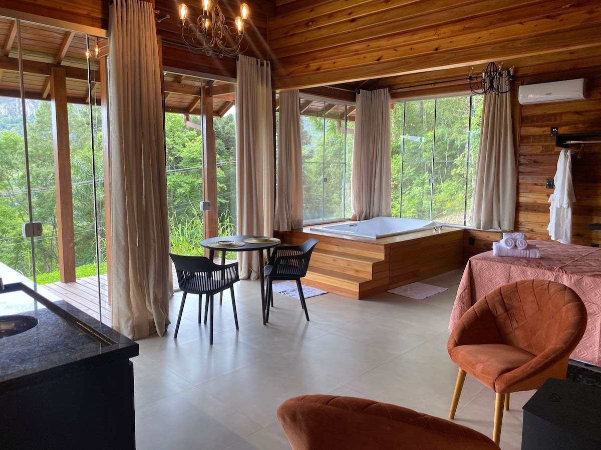 Relaxe neste espaço calmo e cheio de estilo, onde a vista deslumbrante das montanhas se encontra com a melodia da cachoeira. Exclusividade: Desfrute da única cabana em uma área particular de 30.000m². Seu Retiro Empíreo no coração da natureza. Feita em madeira rústica e decorada com requinte, para uma experiência inesquecível, requintada e aconchegante. Tenha o som relaxante da água corrente como trilha sonora para seus momentos a dois, descansando e se divertindo em contato com a natureza.