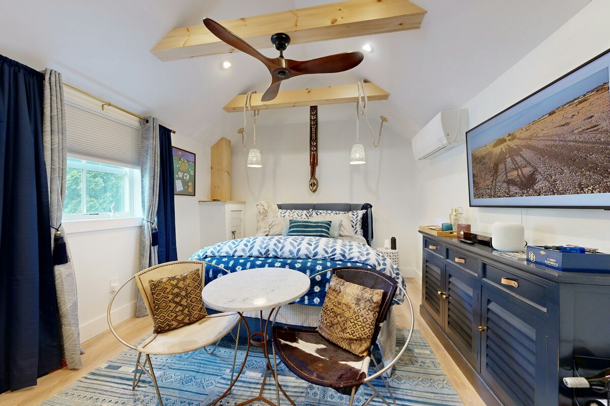 Une maison d'hôtes de 700 pieds carrés avec poteaux et poutres qui peut accueillir 2 personnes. Cuisine ouverte, séjour, coin repas avec salle de bain complète. Les escaliers mènent à une chambre complète au deuxième étage : un lit Queen Size, une demi-salle de bain, un coin salon séparé. Patio arrière privé et douche extérieure. Chalet confortable hors saison avec chauffage radiant et climatisation. Emplacement central par rapport à tout ce que vous voulez voir ! Vélo facile pour aller en ville/à la plage. Très calme et spacieux. Tout le monde dit « tellement plus agréable en personne que sur les photos ». Venez voir par vous-même !