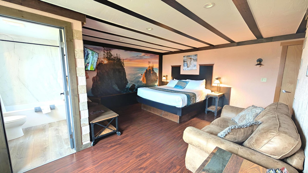Wake to stunning Pacific Ocean views! This renovated Studio features a king bed and a personal balcony, a perfect place to sip your morning coffee. Enjoy a microwave, mini fridge, Keurig, 65" TV, Air conditioning, comfy robes, desk, & seating. Access the beach via stairs, plus enjoy our indoor pool, hot tub, & fine dining onsite. Accommodates 2 guests (including children & babies). Ideal for Olympic National Park day trips! Note: Room layout varies. Locker rooms & exercise room closed.