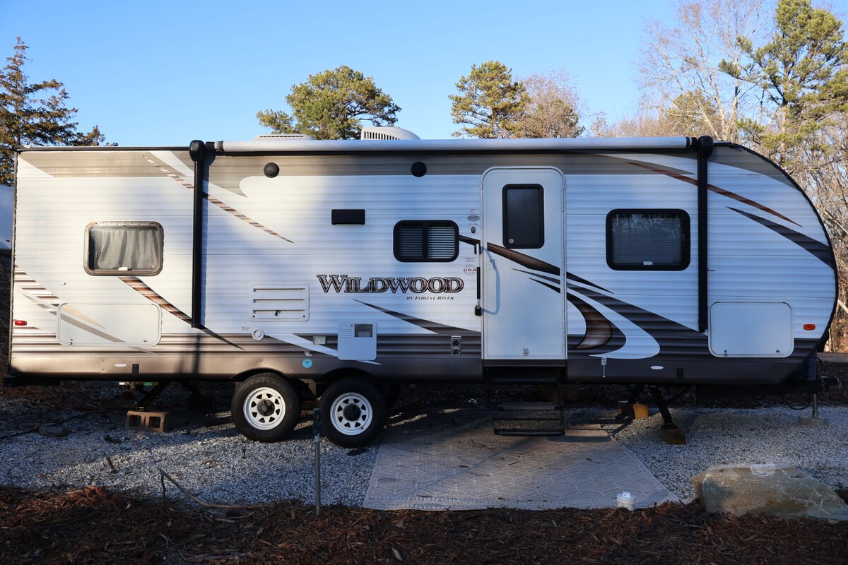 Profitez d'une vue partielle sur le lac depuis notre camping-car récemment rénové en face du lac Hartwell, à seulement 30 minutes de l'Université Clemson. Cette retraite confortable peut accueillir jusqu'à 5 personnes avec un lit queen size, un futon pliant et un matelas pneumatique queen size (dans le bac de rangement du porche). Les équipements comprennent un porche grillagé, des bains publics (rue derrière le camping-car), une buanderie, une piscine, un salon, du ping-pong, du baby-foot, du tennis, des terrains de basket et des sentiers naturels. Matériel de pêche, gilets de sauvetage, avec un quai de pêche à quelques minutes derrière le pavillon principal.