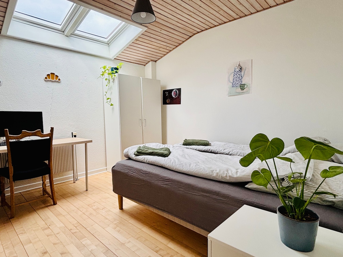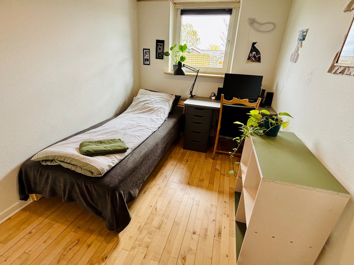 La chambre est au 1er étage, où il y a également une salle de bain privée. Nous vivons nous-mêmes au Rez-de-chaussée. La chambre est belle grande de 15 m2, où il y a un lit double pour 2 personnes. De plus, il y a un petit coin où vous pouvez vous asseoir et profiter de la vie. La chambre est proche du centre-ville et de l'université. Des vélos peuvent être empruntés. N'hésitez pas à apporter le linge de maison et les serviettes vous-même, mais nous saurons si vous avez d'autres vœux. Si vous voulez utiliser le jardin, ce sera également possible.
