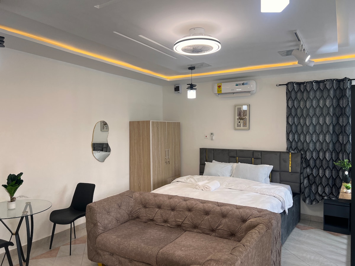 Profitez de cette élégante suite d'une chambre à East Legon, à quelques minutes de l'aéroport, du centre commercial A&C et du centre commercial Accra. Entouré de restaurants et de boutiques, il offre une terrasse sur le toit avec une vue imprenable, des restaurants en plein air au rez-de-chaussée et sur le toit, une piscine, une connexion Wi-Fi fiable, une alimentation 24h/24 et 7j/7 et la sécurité. Conçu avec soin pour votre confort, c'est le mélange parfait de commodité, de luxe et de détente au cœur d'Accra.