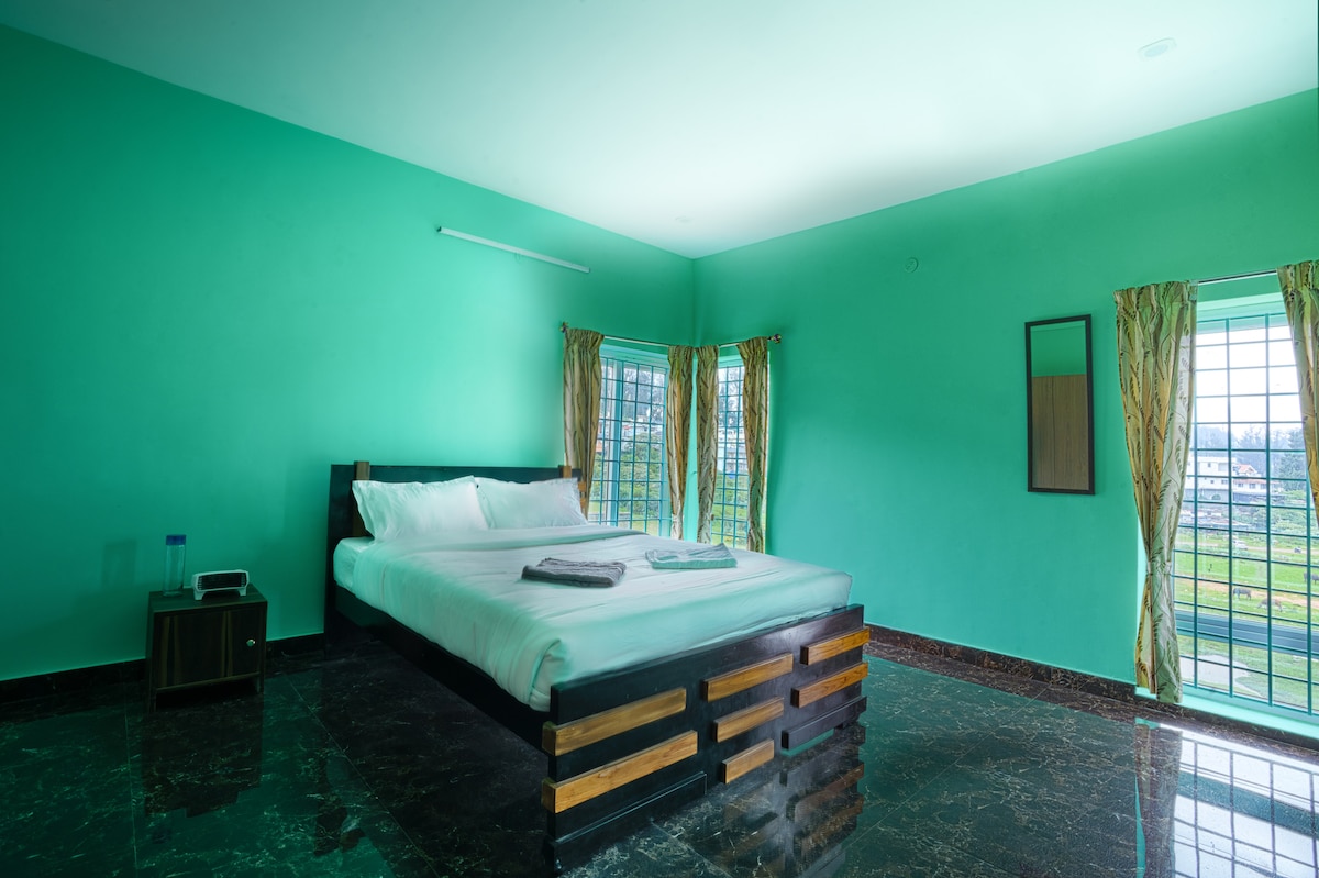 Reprenez la nature dans une escapade inoubliable avec une expérience unique et sereine avec sa vue à couper le souffle. La propriété est entourée de 100 acres de jardin à thé, vous entrez dans un environnement paisible qui rafraîchit l'âme, l'esprit et l'esprit. L'espace 3 BR spacieux avec radiateurs chacun offre une vue sur le jardin de thé avec toilettes attenantes. Il y a un coin repas avec cuisine équipée INCLUSION : boissons de bienvenue, petit déjeuner. Table de billard Wi-Fi gratuite Jeux en intérieur Espace de travail dédié