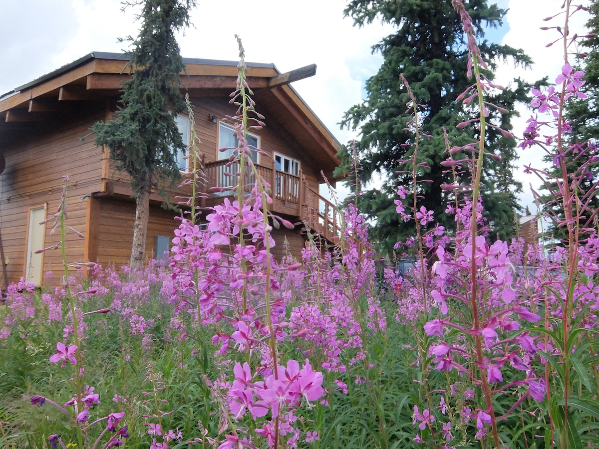 The Chinook Chalet is a charming Alaskan log cabin on a 2.5-acre privately owned lot, tucked away in the woods. The spacious front deck is a perfect place to relax after exploring the area. You can enjoy the backyard by sitting around the gas firepit. Easy access and conveniently located just 7 miles south of Denali National Park entrance, and only 1 mile from the park boundary. It's an easy 5-mile drive to Creekside Cafe (a local favorite) and Panorama Pizza.