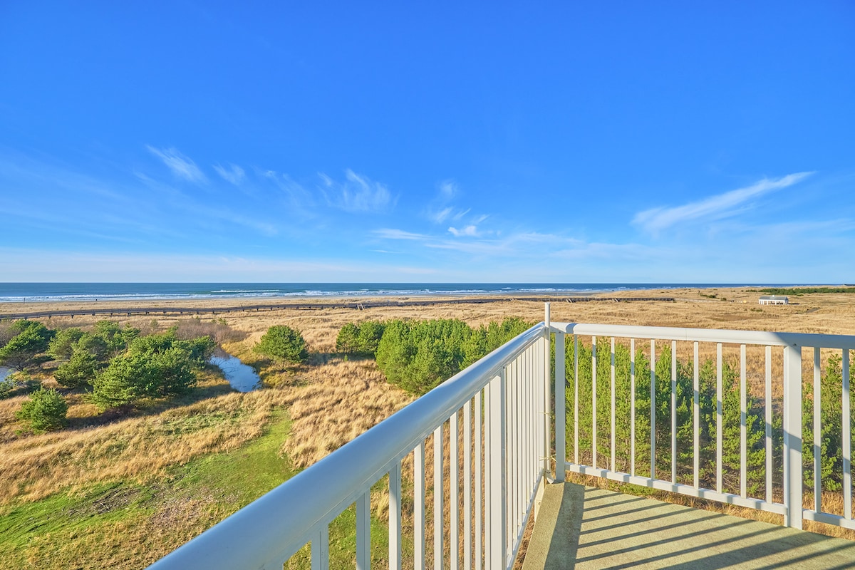 Profitez d'une vue spectaculaire sur l'océan depuis cet appartement au dernier étage ! Emplacement isolé avec rien d'autre que des dunes pittoresques et de la faune entre vous et la plage. Profitez de l'accès à la découverte des sentiers de randonnée juste devant votre porte : prenez l'un des vélos gratuits sur la propriété. Piscine intérieure, jacuzzi et sauna sur la propriété ainsi que des couchers de soleil inégalés depuis votre grand balcon. Des barbecues attendent vos créations culinaires ou se livrent à un match de cornhole ou de fer à cheval ! Petit déjeuner servi tous les jours !