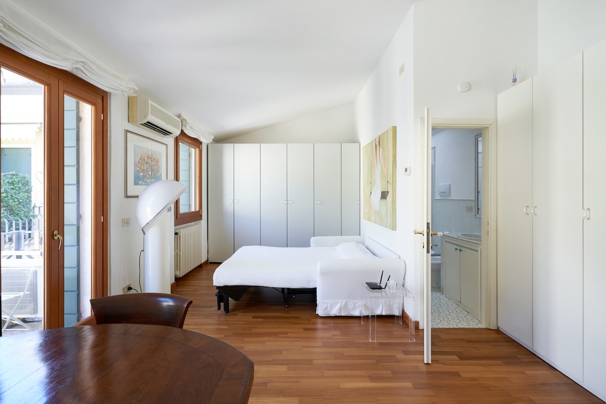 L'appartamento è un monolocale nella zona pedonale e ztl nel cuore di Padova, all'ultimo piano. È elegante e luminoso composto da una camera con divano letto matrimoniale, angolo cottura attrezzato a scomparsa, due finestre ed un balcone affacciati sulla tranquilla corte interna. Bagno finestrato con doccia. È provvisto di aria condizionata, free WIFI, tv e completo di biancheria. Le chiavi e tutte le informazioni sulla città, eventi in tedesco, inglese, francese vengono fornite personalmente.