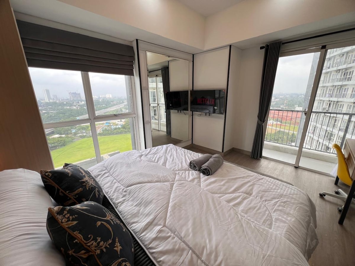 Profitez d'une expérience élégante dans un lieu situé au centre, à proximité des installations de divertissement, de shopping et de loisirs Équipements de la chambre - 1 lit king size - Wifi + Netflix - Chauffe-eau - Réfrigérateur - Distributeur - Climatisation - Télévision - Table de maquillage - Sèche-cheveux - Fer à repasser - Cuisine et ustensiles de cuisine Installations du bâtiment - Piscine - Salle de sport - Cafétéria - Mini-marché * Indomaret * Cirkel K 24 heures - Parking (payant) - Blanchisserie Divertissement et shopping - Aeon Mall - ice bsd - The breeze bsd - Q big Mall