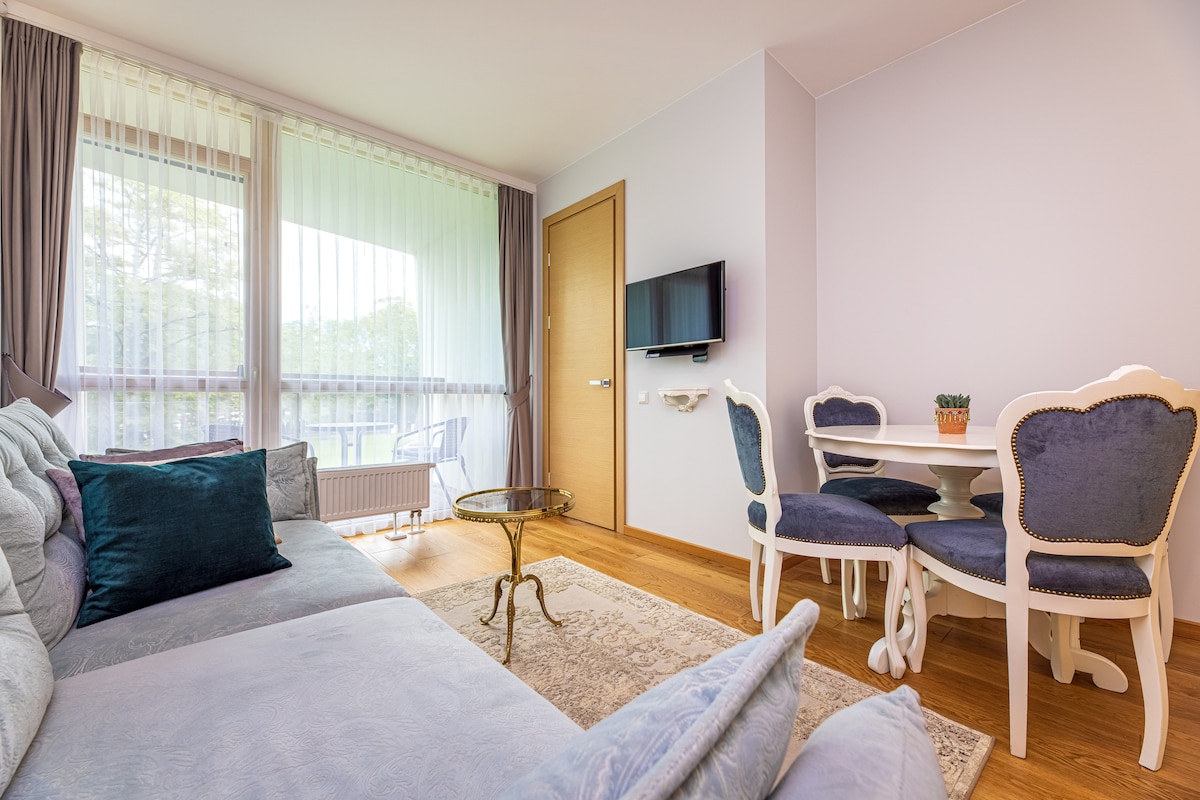 Appartement quadruple studio confortable et entièrement équipé dans un quartier calme de Šventoji, à seulement 10 minutes à pied de la mer. Dans le complexe : piscine chauffée pour enfants et adultes, salle de sport, terrains de sport, coin barbecue, salle d'enfants, aire de jeux, espace de travail. Dans l'appartement : kitchenette, salle de bain, TV, Wi-Fi, climatisation, chauffage. Parfait pour se reposer à tout moment de l'année !