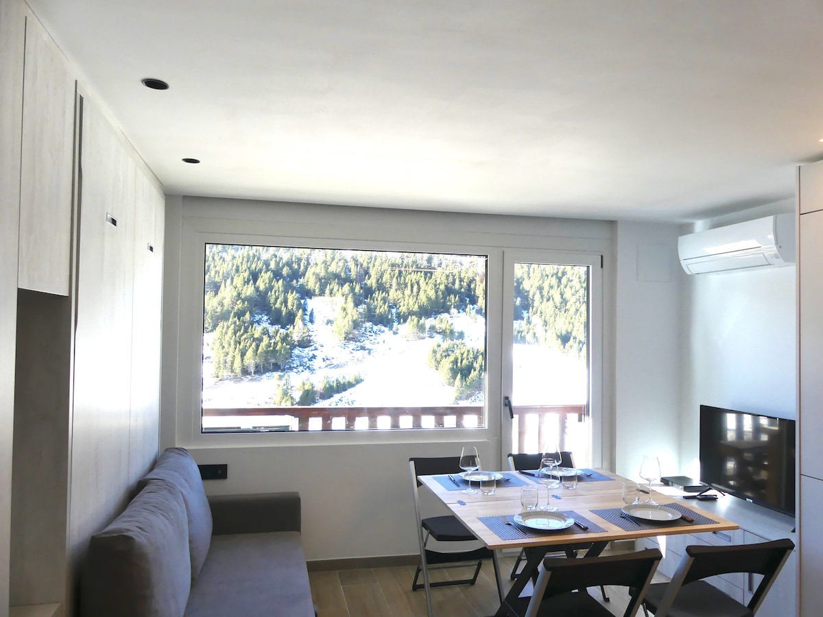 Situé dans un immeuble ancien, vous trouverez un studio moderne et confortable conçu pour accueillir un maximum de 4 personnes, alliant style contemporain et fonctionnalité, créant une atmosphère relaxante. Il est entièrement rénové avec vue sur la montagne et première ligne du Snow Park nocturne. En été, c'est idéal pour faire des randonnées d'où vous pourrez vous rendre aux 3 lacs de Pesons, lacs de Solana. Montez aux sommets de Cabaneta, Fontnegre, Pic Noir d'Envalira. Et un parcours de gol
