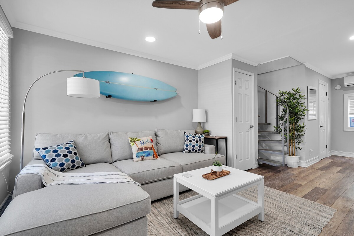Condo PRIVÉ dans un immeuble de 4 condos indépendants. Maintenant avec tapis (non représenté sur les photos). Pas d'espaces partagés. À 5 minutes à pied de la plage et à 10 minutes à pied des restaurants/bars du centre-ville de Jax B ! À 10 minutes en voiture de Mayo. Ce condo de plage moderne est exactement l'escapade dont vous avez besoin ! Appartement à L'ÉTAGE entièrement rénové avec une décoration luxueuse, moderne et chic. Wifi rapide et espace de travail dédié. Laveuse/sécheuse dans le logement. Douches extérieures et places de stationnement. Veuillez noter que ce n'est plus un logement où les animaux de compagnie sont les bienvenus. Unit D