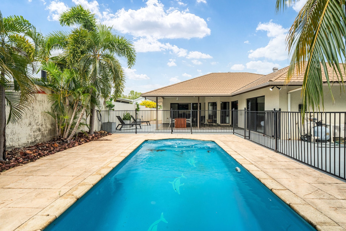 Bienvenue dans votre escapade tropicale privée à Darwin, une maison aérée et décontractée conçue pour la détente, le plaisir et des souvenirs inoubliables. Niché dans un jardin luxuriant à seulement 3 km de la plage, c'est l'escapade parfaite pour les familles, les couples, les amis et les compagnons à fourrure ! • 💦 Votre propre piscine tropicale privée Ce n'est pas une piscine ordinaire, c'est une grande piscine étincelante de style tropical, entourée de palmiers luxuriants et de verdure naturelle avec des arbres bien établis.
