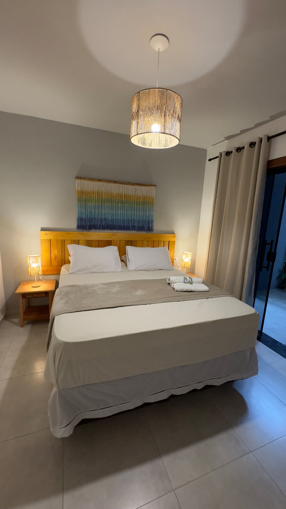 Suite confortable, récemment ouverte, face à la mer. Située sur la plage de Pontal, à 4 minutes à pied du centre historique. Internet par fibre optique, Wi-Fi de grande portée dans tout l'environnement. Kitchenette équipée d'une cafetière, d'une bouilloire électrique et d'un minibar. Excellente salle de bain, eau sous pression et douche à gaz. Air conditionné. Lit double queen, matelas orthobom ligne hôtelière. Décoration authentique dans chaque chambre, avec de l'art indigène de peuples de différentes régions du Brésil. - suite au rez-de-chaussée -