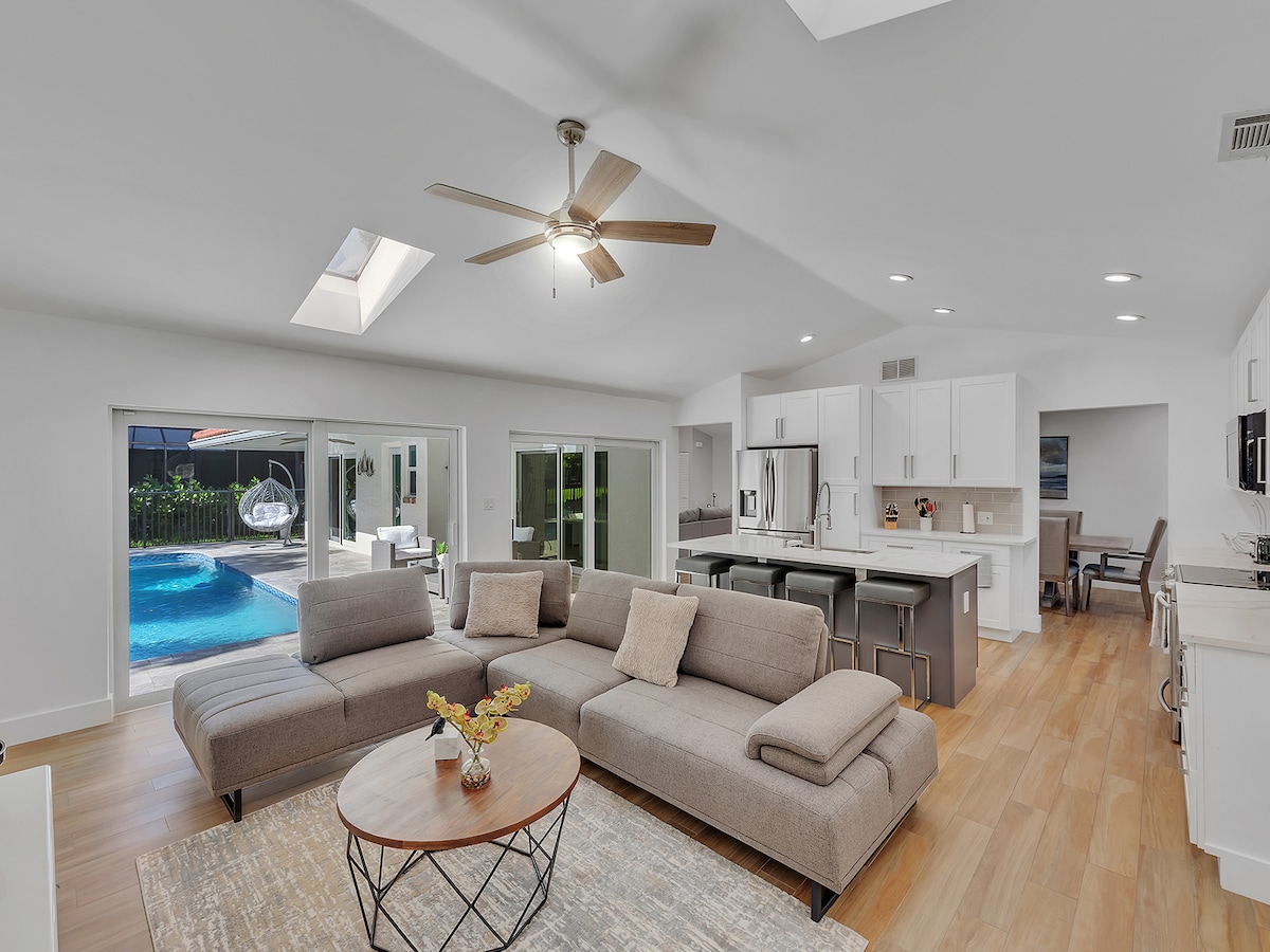 Maison entièrement rénovée de 3 chambres en bord de lac dans un quartier paisible de West Boca Raton. Amusement de luxe dans l'arrière-cour pour tous les âges ! Grand espace de vie extérieur sous une hutte tiki, putting green de golf privé, gazon sans entretien et patio en béton propre parfait pour la pêche, les bains de soleil et la cuisine. Cuisine entièrement équipée, jeux d'arcade grandeur nature, ps5, téléviseurs intelligents 60" dans chaque pièce et à l'extérieur ! Envoyez-nous un message directement pour les séjours de plus d'un mois/questions supplémentaires.
