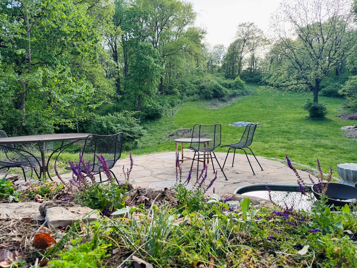 L'escapade parfaite à proximité de tout ! Profitez de votre intimité dans notre bungalow restauré de 1933 sur 18 acres à quelques minutes de l'I-70. Détendez-vous après un voyage sur la route ou rassemblez vos amis pour un concert. Plongez dans la baignoire et passez votre meilleure nuit de sommeil sur un matelas moelleux. Cuisinez dans une cuisine approvisionnée ou mangez dans des restaurants à cinq minutes. Promenez-vous le long des sentiers tondus et laissez les enfants jouer ! Nous acceptons les animaux de compagnie et sommes prêts pour les entreprises avec l'Internet Gigabit et une configuration de bureau.