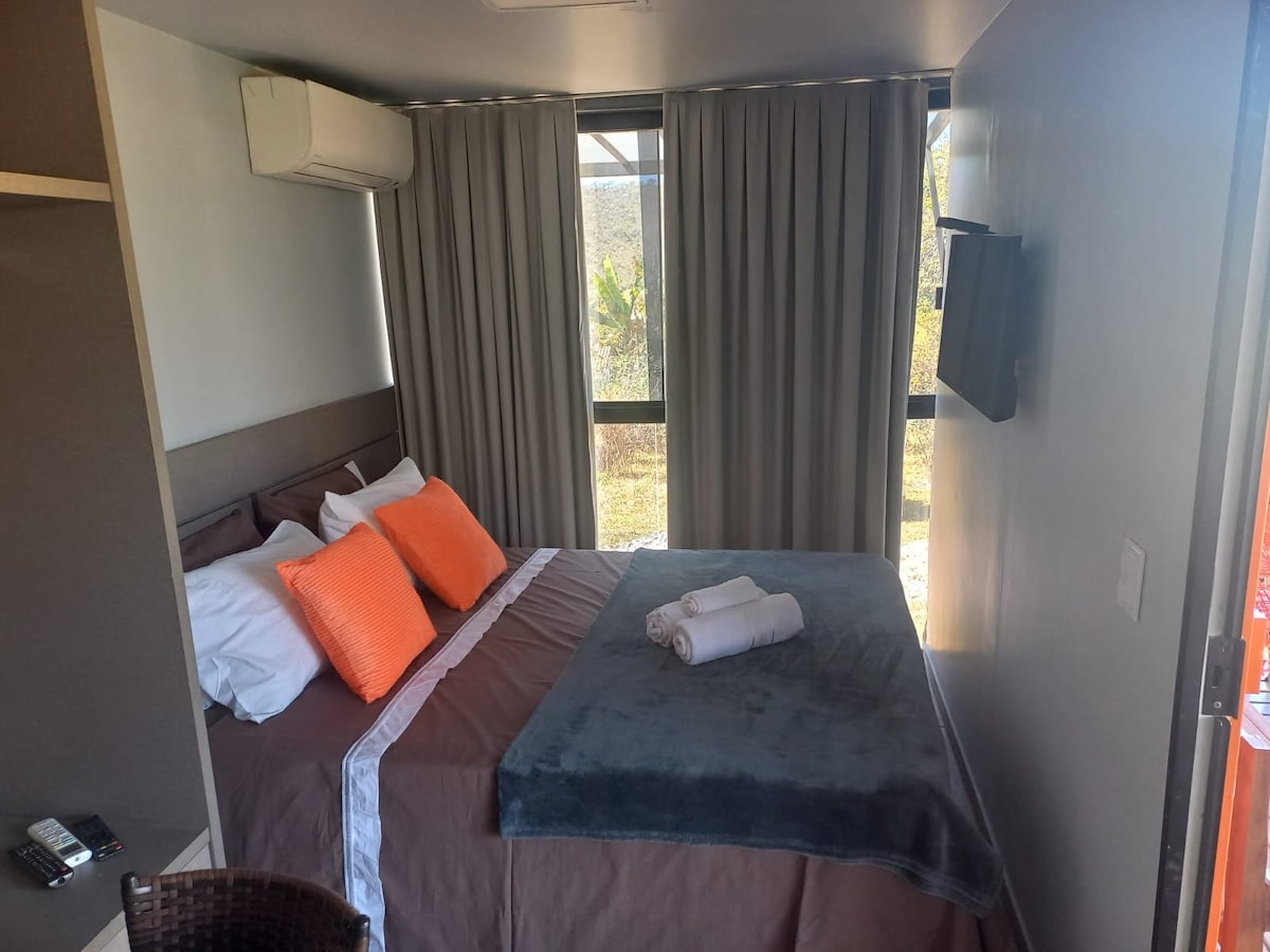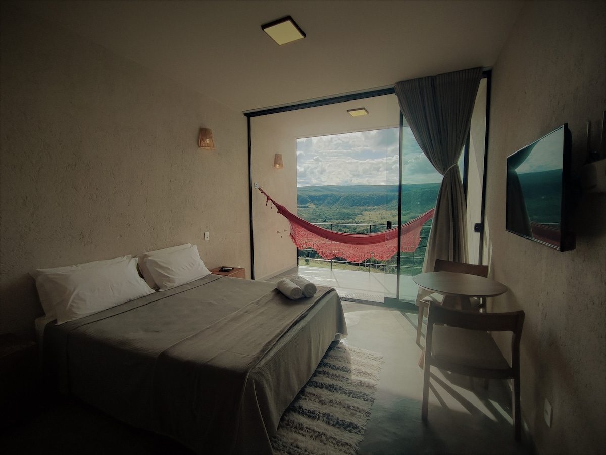 La Suite est un hébergement de charme au sein de Pousada Flor de Debora, au cœur de Vila São Jorge (district d'Alto Paraíso de Goiás). Nous sommes à 1 km de l'entrée du parc national de Chapada dos Veadeiros et à 5 km de Vale da Lua. La suite dispose de deux chambres (une avec un lit queen-size et l'autre avec un lit simple), de la climatisation, d'un minibar, d'une salle de bain privée et d'un garage. Nous avons des espaces communs avec des hamacs, des tables et un bel espace pour un feu de camp pour compléter le confort au milieu de la nature. Bienvenue !