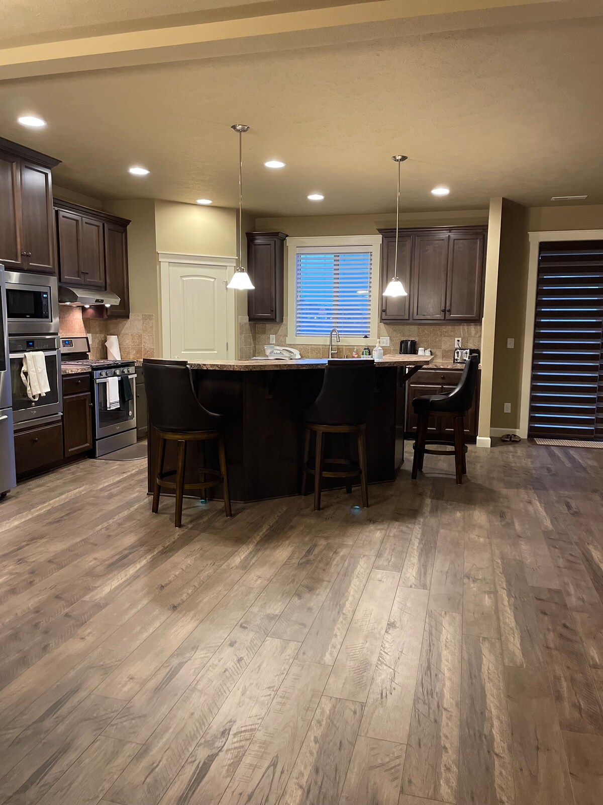 Confortable nouveau rambler 4 chambres situé dans les magnifiques Tri-Cities. Plan d'étage ouvert, plafond voûté, télévision à écran plat 65 pouces, équipements de cuisine complets. Au cœur de la région viticole, à 3 km du fleuve Columbia, à 8 km du centre commercial. Beaucoup de restaurants et d'activités à proximité.