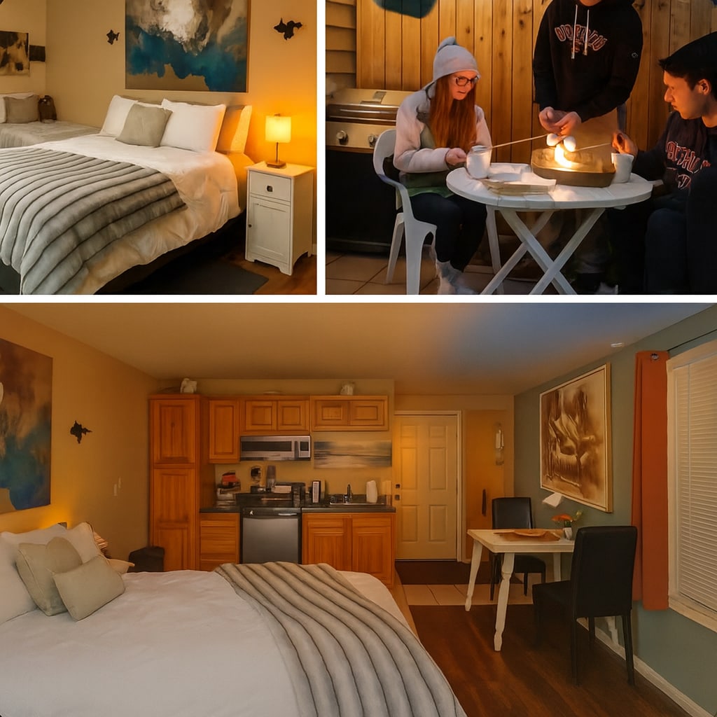 Notre confortable studio de 2 lits, 3 personnes sur le thème des chevaux est entièrement privé, vous pouvez donc aller et venir facilement. Salle de bain privée. Salle à manger. 😄Beaucoup de collations incluses. 😋🍿 Bar à café Keurig☕️ Beaucoup d'options pour cuisiner vos propres repas.🍳 Avec Yokes Fresh Market à seulement une minute. 🛒 À l'intérieur : Roku TV pour votre plaisir.📺 Jeux de société, livres. À l'extérieur : jeu de fer à cheval, super mini terrain de golf, jeu de sacs de haricots, foyer sur 🔥table, barbecue. Forfaits 🔥spéciaux pour les escapades. Service de blanchisserie disponible sur demande.🧺