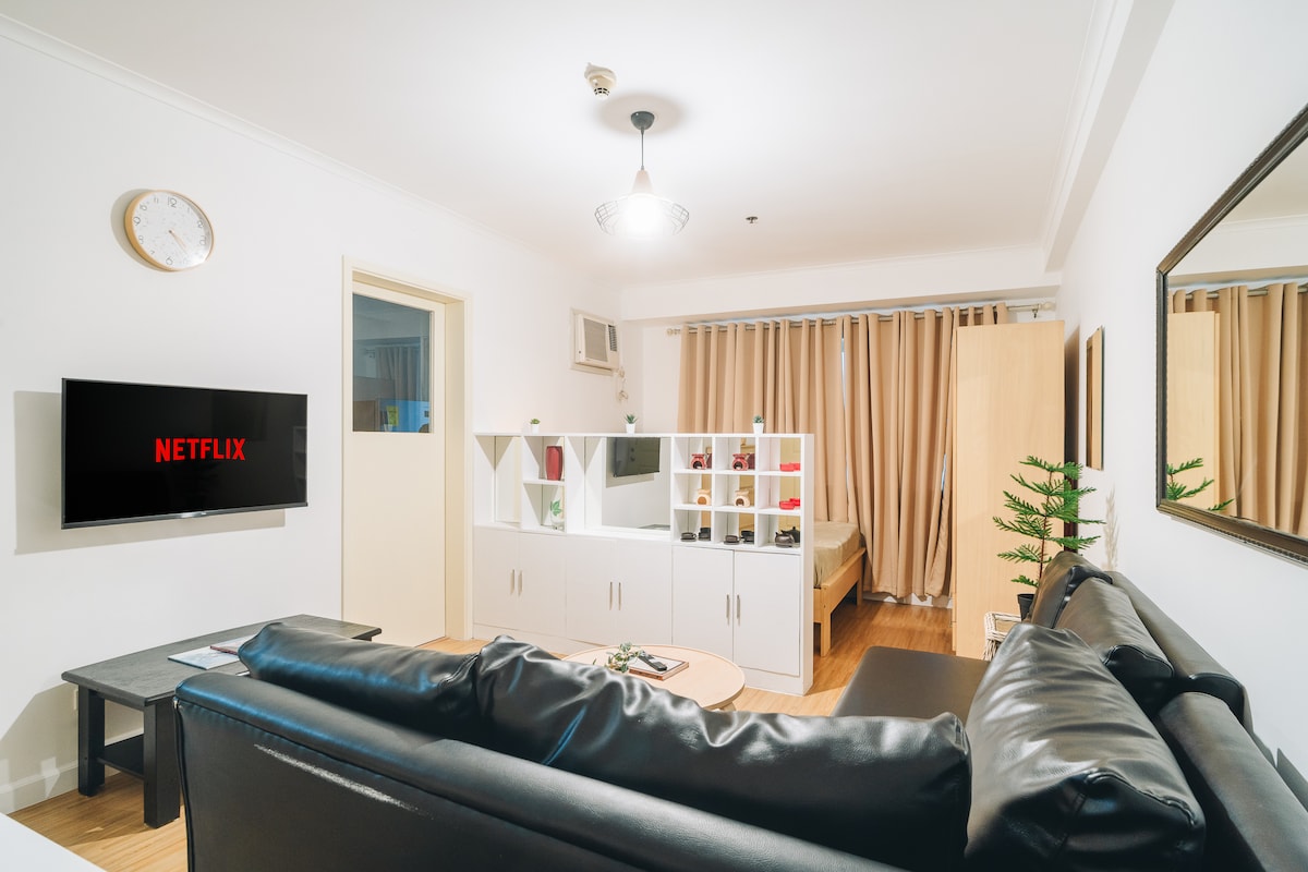 Avec des intérieurs frais d'inspiration tropicale, ce logement de 1 bar dans One Uptown Residences at Bonifacio Global City offre aux voyageurs un séjour mémorable et relaxant. *WIFI 400Mbps GRATUIT, Smart TV, câble, Netflix, Disney+ *Lave-linge et sèche-linge *Piscine *Cuisine entièrement équipée avec cuisinière, réfrigérateur, micro-ondes, cafetière, grille-pain, ustensiles de cuisine et de salle à manger. Situé juste en face du centre commercial Uptown, du Palace, du centre commercial Mitsukoshi et du Grand Hyatt Hotel. À 7-10 min à pied du St. Luke's Medical Center et de High Street à BGC.
