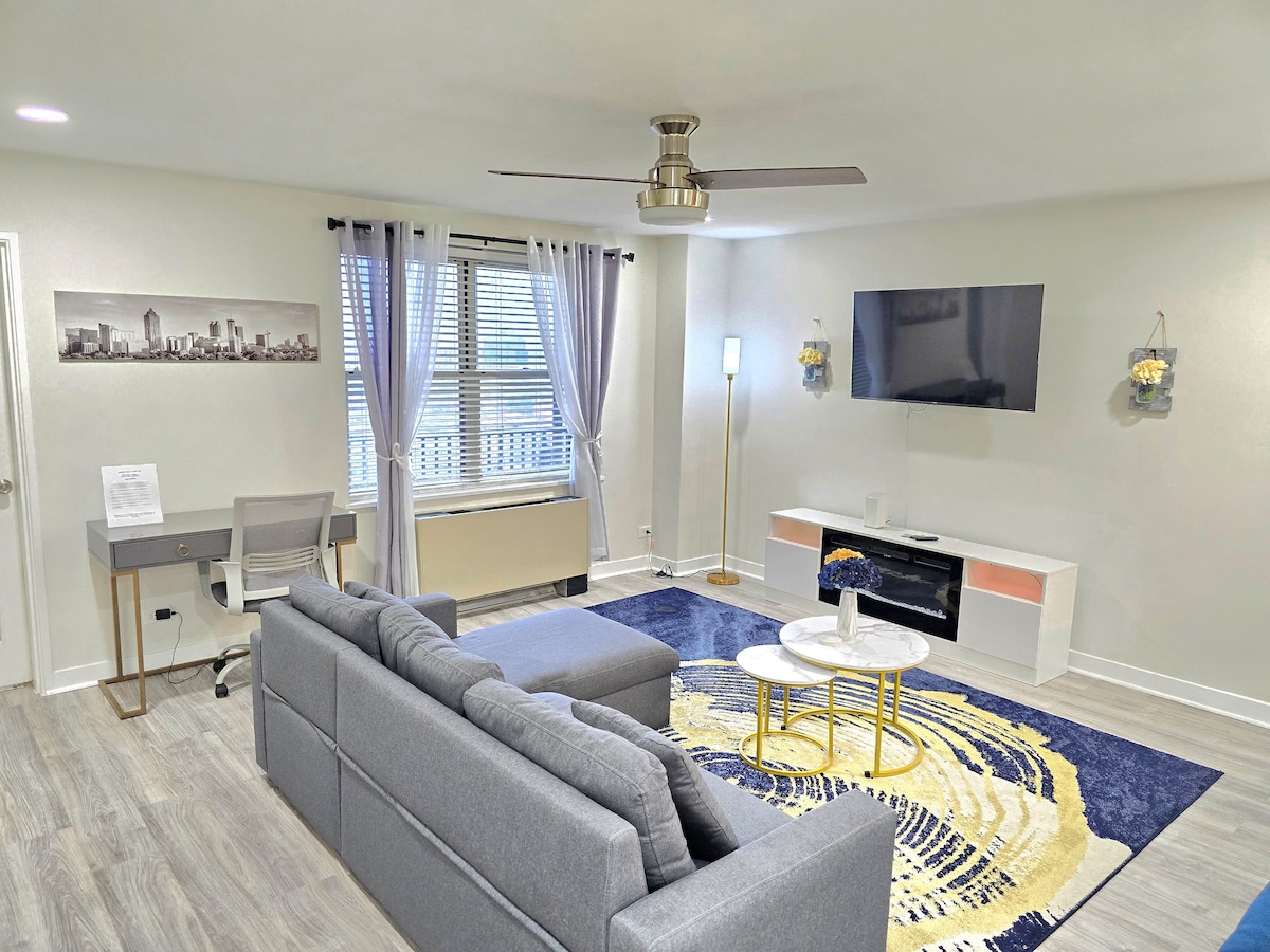 Situé au CŒUR du centre-ville d'Atlanta, cet appartement RÉNOVÉ de 750 pieds carrés est l'ENDROIT IDÉAL pour tout ce qu'Atlanta a à offrir. Au 10e étage, 1 lit-1 salle de bain, il comprend un porche grillagé et TOUTES les commodités de la maison et peut accueillir confortablement 4 adultes. La chambre dispose d'un lit Queen Size confortable avec un placard et un bureau pour le travail. La cuisine dispose d'une machine à café Keurig + K Cups, de comptoirs en granit, de sols carrelés et d'appareils électroménagers en acier inoxydable. Le salon dispose d'un canapé-lit Queen Size avec matelas en mousse à mémoire de forme, d'une télévision connectée 4K de 55 pouces et d'une connexion Wi-Fi rapide.