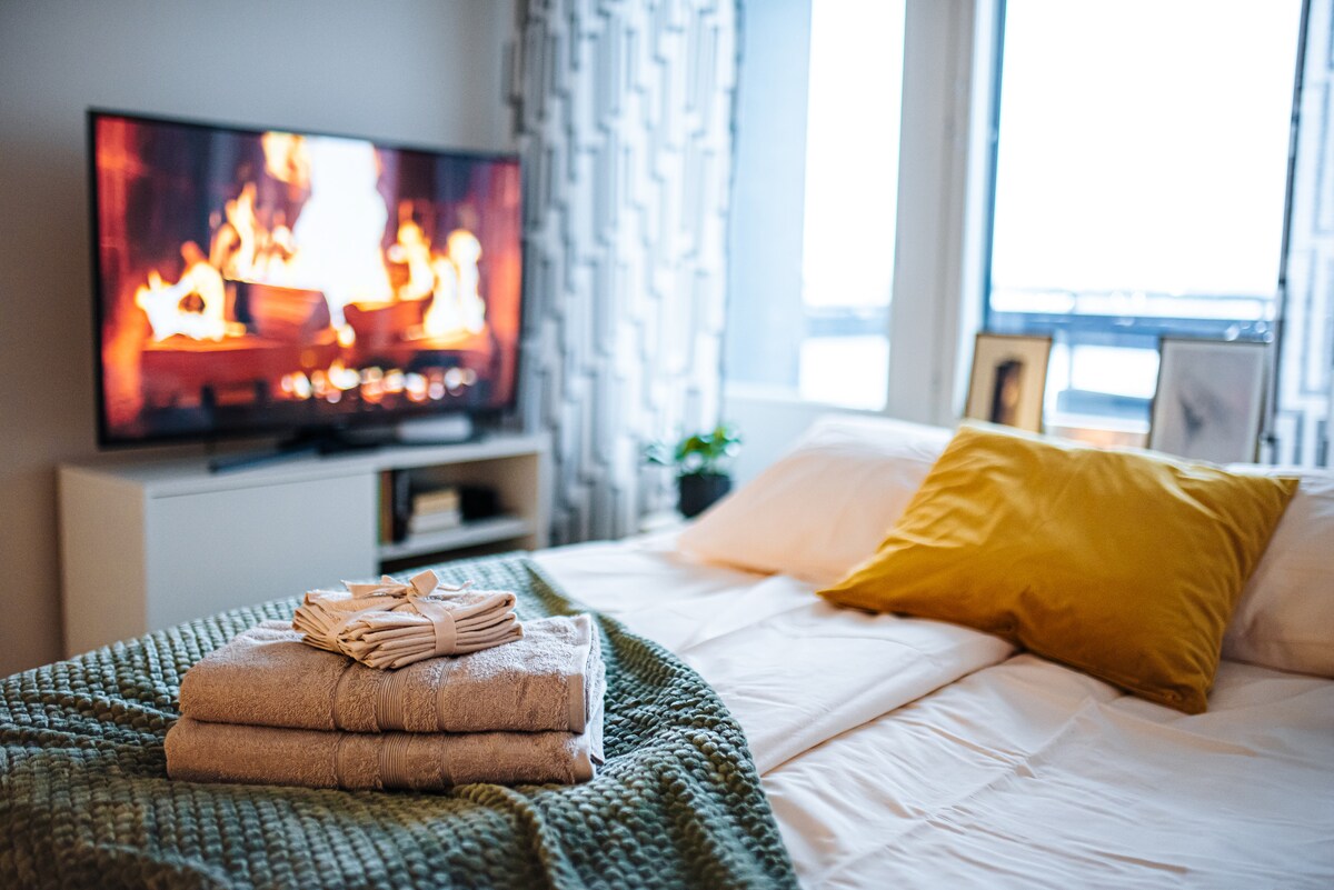 Suite Winter Dream – Luxe et détente près du centre-ville Cet appartement impeccable et de haute qualité peut accueillir jusqu'à quatre personnes et dispose d'un sauna privé et d'un balcon confortable. L'emplacement est parfait : un cadre paisible garantit des nuits reposantes, mais le centre-ville avec ses services et ses attractions est à quelques pas seulement. Appartement de style scandinave au 2e étage avec un grand salon, une alcôve avec un lit queen size, un sauna et un balcon meublé. Cuisine entièrement équipée.