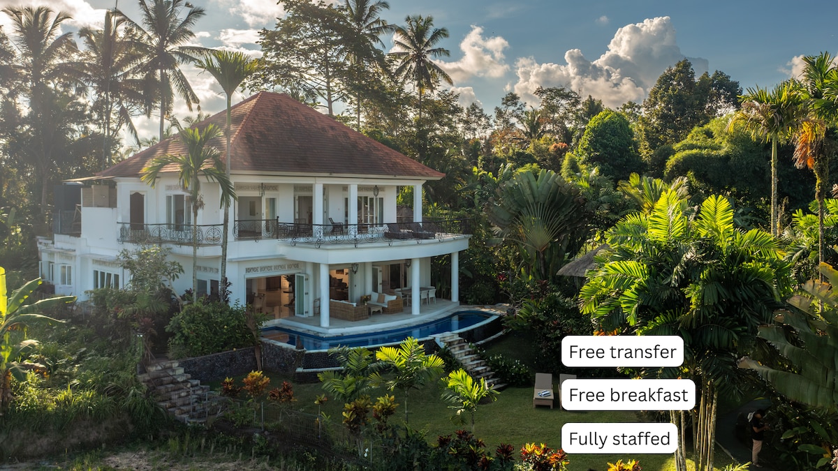 La Villa Shamballa est un havre de paix spirituel et tranquille qui offre une expérience de villa privée intime et indulgente. Ce refuge romantique perché par magie au sommet d'un ravin le long de la mystique rivière Wos est l'endroit idéal pour un couple, en particulier pour leur lune de miel et leur anniversaire et leur anniversaire. « Offre spéciale uniquement pour les lunes de miel et les anniversaires (même mois que votre séjour) - Réservation avant le 1er novembre 2025. Dîner romantique aux chandelles de 3 plats au bord de la piscine - séjour minimum de 3 nuits