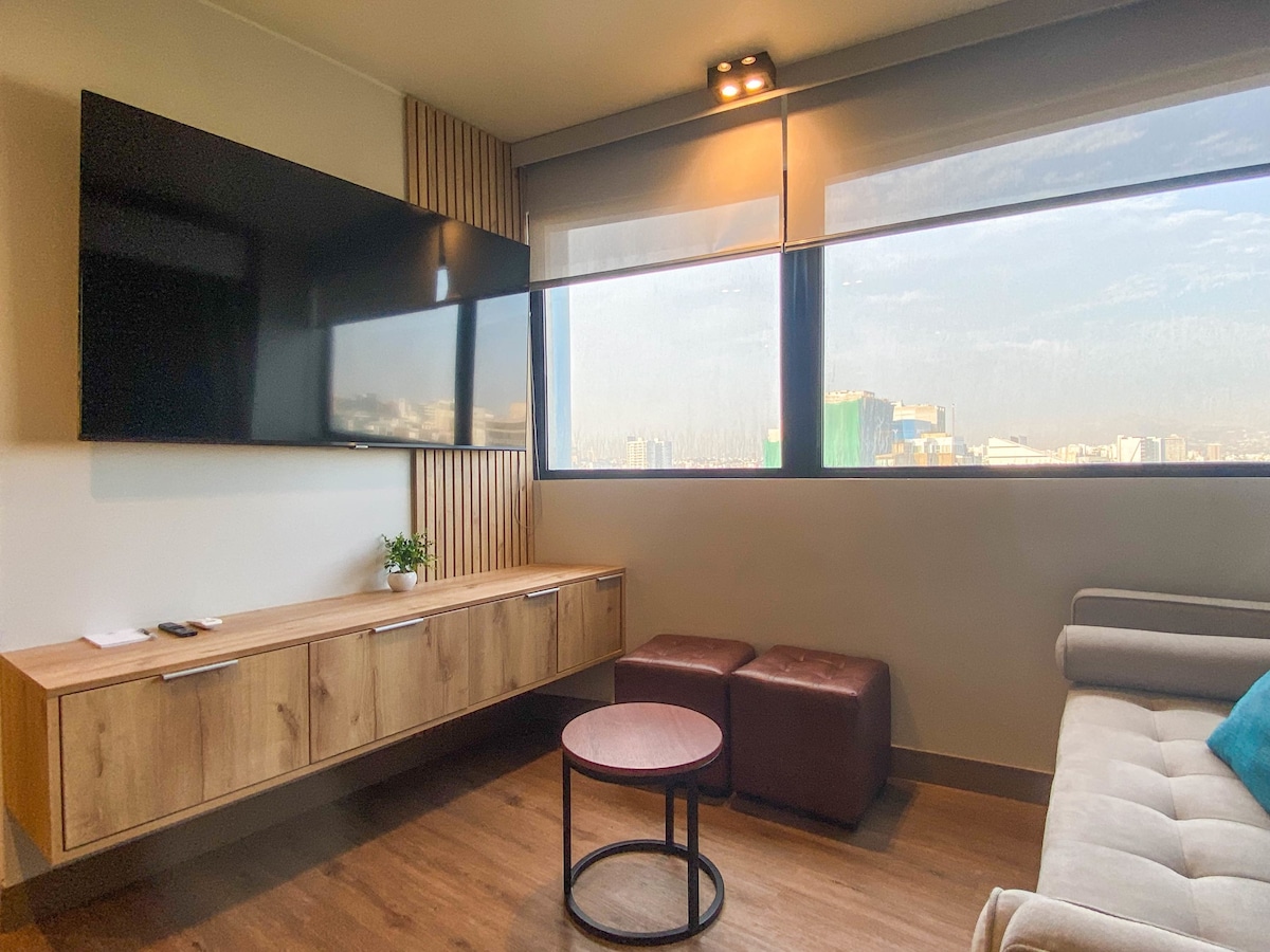 C'est un espace moderne et confortable, dans un immeuble destiné aux appartements Airbnb, situé au cœur du bloc, ce qui le rend calme et sûr, mais en même temps central, il dispose d'un patio et de deux terrasses avec vue panoramique sur la ville et les montagnes, avec des espaces généreux tels que le coin chambre avec placard, une kitchenette bien équipée avec une table à manger, une télévision intelligente de 50 pouces, une salle de bain moderne avec un bon éclairage et une bonne ventilation, qui rendront votre séjour agréable et plaisant