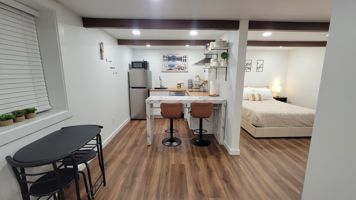 Une retraite privée de type spa dans un quartier calme à trois pâtés de maisons du centre-ville. Conçu pour la détente : douche double et hammam complet, huiles essentielles, bancs en teck ; deux bancs de baie vitrée pour s'étendre avec un livre ; et un grand balcon au deuxième étage pour respirer l'air frais de la montagne avec votre café du matin. Finitions en granit, quartz et érable ; plafonds voûtés et vue sur la montagne. Une véritable oasis de tranquillité. UBI n° 604 130 4-thirty-2