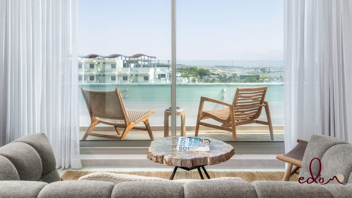 Un appartement entièrement rénové, spacieux et magnifique. situé dans un complexe calme et sûr, à seulement quelques minutes à pied de la plage, des restaurants et des bars et à quelques pas d'un grand supermarché. L'appartement dispose d'une chambre, d'un salon, d'un coin repas, d'une cuisine entièrement équipée, L'appartement dispose d'un balcon avec vue panoramique sur la mer et vous pouvez vous asseoir et profiter de la baie d'Eilat et des montagnes rouges.