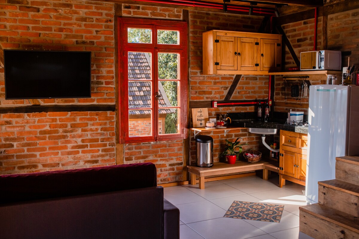 O CHALÉ VERMELHO é um dos seis chalés da Vila Entre Montanhas, localizada no centro da charmosa Picada Café (Serra Gaúcha), a 1h15min de Porto Alegre. São 100m² que acomodam até 05 pessoas em 01 cama king, 01 cama queen e 01 sofá-cama. Além da vista para as montanhas, conta com hidromassagem com cromoterapia e sais/espuma de banho, calefator a lenha, Smart TV, wi-fi, ar-condicionado, varanda para curtir o nascer do sol/estrelas, rede, parrilla e lareira ecológica.