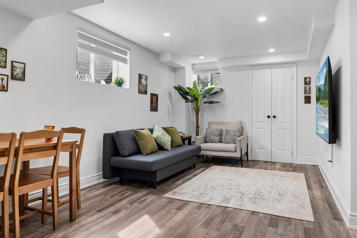 Appartement PRIVÉ en sous-sol avec entrée indépendante. Espace de 420 pieds carrés. Lit Queen Size. Douche surdimensionnée avec pomme de douche à effet pluie. Micro-ondes, deux mini-réfrigérateurs, cafetière/théière à eau chaude. Remarque : ce n'est pas une cuisine complète. Table à manger / travailler avec bancs. Wi-Fi haut débit. Salon avec canapé inclinable Lazy Boy et télévision connectée de 50 pouces. Plus de 1 000 chaînes de télévision en direct et Netflix. Petit patio arrière privé avec table. Allée privée (2 voitures). À 1 min en voiture de l'autoroute 401. À 15 min à pied de la gare Ajax Go.