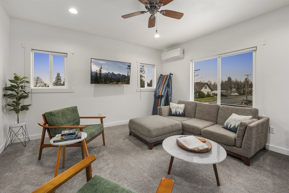 Bienvenue dans ce nouveau duplex Puyallup de 3 chambres/2 salles de bain en 2021. Notre location à l'étage supérieur est parfaitement nichée dans le centre-ville de Puyallup, Washington. À votre arrivée, vous serez accueilli avec une vue sur le mont Salon plus pluvieux et ouvert avec cheminée et cuisine gastronomique. Idéalement situé à seulement 3 pâtés de maisons des restaurants locaux, du terrain de la foire du Puyallup et du train Sounder vers Seattle. Le WI-FI, les téléviseurs connectés par câble ainsi qu'une serrure connectée sont fournis pour une arrivée facile. (Animaux bienvenus) Profitez-en!