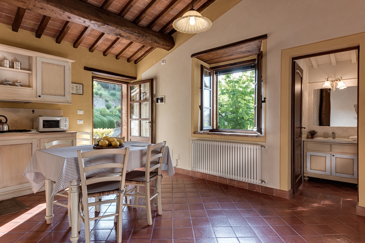 Appartement en pierre et briques dans le « Podere la Castellina » dans le magnifique parc naturel de la Montagnola Senese. L'appartement situé au premier étage peut accueillir confortablement 5 personnes (4+1) et comprend : - grand salon avec cheminée et canapé-lit - cuisine - 2 chambres : une avec un lit double et une avec deux lits simples - deux salles de bains À la disposition des clients piscine panoramique, solarium et terrasse avec vue imprenable, équipée d’un four à bois et barbecue.