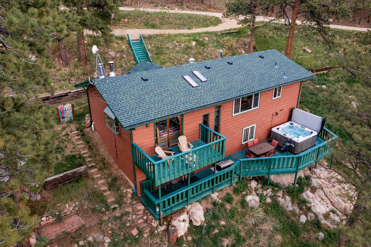Bienvenue dans notre confortable cabane de pin ! Cette adorable cabane est nichée parmi les ponderosas et les genévriers sur son propre terrain clôturé (les chiens l'adorent) près de Bailey, CO. Les deux terrasses arrière offrent une vue privée sur la montagne forestière avec un luxueux *ÉNORME* jacuzzi pour 6 personnes et un foyer à gaz essentiel à l'expérience de la cabane confortable ! Nous avons également un grand hamac à filet qui est tellement cool pour passer du temps avec votre groupe. Situé à seulement 40 minutes au sud-ouest de Denver, venez échapper à la vie citadine dans notre retraite de montagne relaxante !