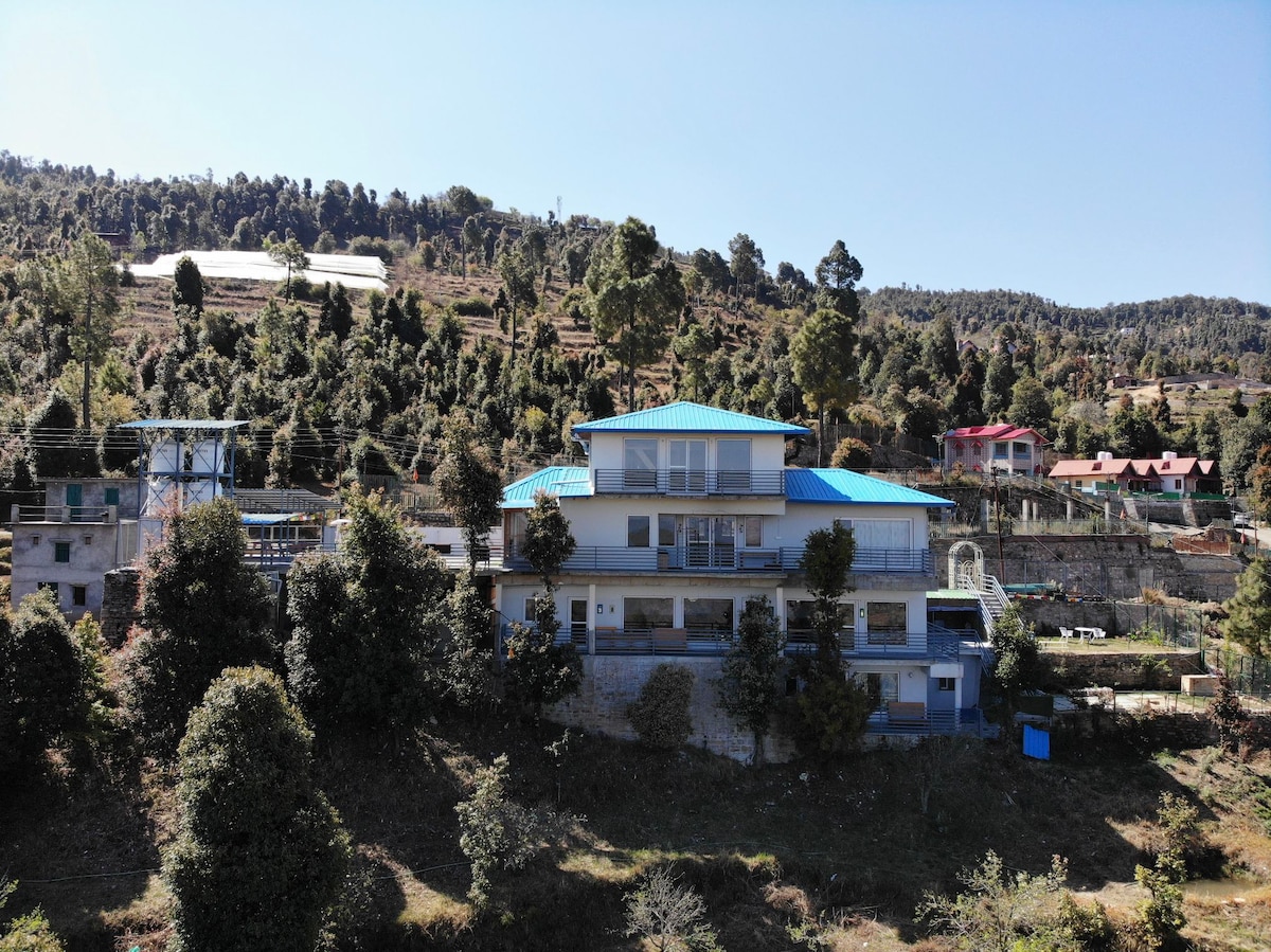 Bienvenue à Jaadooghar x Chitai Life, Almora. Vivez dans les montagnes dans cette maison de montagne luxuriante et adaptée aux animaux de compagnie qui offre un répit décontracté avec des équipements et des expériences époustouflants. Nous avons 3 chambres avec toilettes attenantes et équipements modernes. Profitez : ➤Plats Kumaoni frais par des chefs qualifiés ➤Salon, télévision, bureau, terrasse, maison de verre, grande pelouse (avec extérieur salle à manger, installation de feu de camp) ➤Jeux de société/de cartes, ➤Stationnement Installation de ➤pique-nique, repas en plein air, cours de pâtisserie, pizza au feu de bois, treks dans la nature