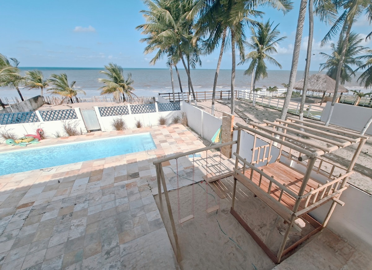 Casa mobiliada à beira-mar, com dois pavimentos,contendo no ANDAR INFERIOR: terraço, sala para dois ambientes, hall, 01 suíte (com ar-condicionado), 01 banheiro social, copa/cozinha, área de serviço e despensa. ANDAR SUPERIOR contendo 03 suítes (todas, com ar-condicionado), rouparia e área de circulação ÁREA EXTERNA: piscina, jardim gramado com 02 coqueiros, quiosque e vaga para 04 carros. O imóvel encontra-se todo equipado.