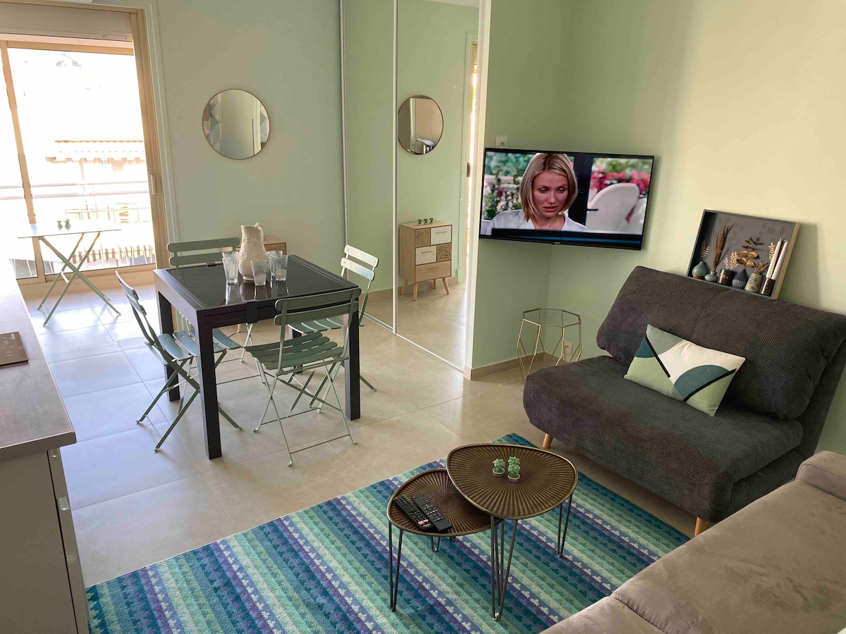Studio de 28 m2 pour 2 personnes climatisé en rez de jardin dans résidence calme avec place de parking privé, proche commerces,transports et plages. Commerces : 10 mn a pied transports : arrêt de bus en face de la résidence,gare a 2 mn à pied Bus : 10 mn en bus pour vous rendre au Palais des festivals ( trafic fluide ) Train : 5 mn de train pour vous rendre a la gare de Cannes et il vous reste 6 mn de marche pour vous rendre au Palais des festivals plages : 5 mn à pied