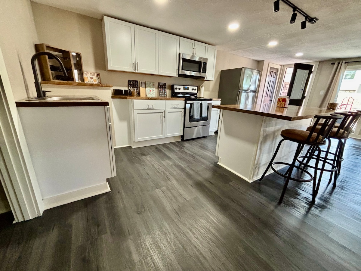 L'escapade parfaite à proximité de tout ! Profitez de votre intimité dans notre bungalow restauré de 1933 sur 18 acres à quelques minutes de l'I-70. Détendez-vous après un voyage sur la route ou rassemblez vos amis pour un concert. Plongez dans la baignoire et passez votre meilleure nuit de sommeil sur un matelas moelleux. Cuisinez dans une cuisine approvisionnée ou mangez dans des restaurants à cinq minutes. Promenez-vous le long des sentiers tondus et laissez les enfants jouer ! Nous acceptons les animaux de compagnie et sommes prêts pour les entreprises avec l'Internet Gigabit et une configuration de bureau.