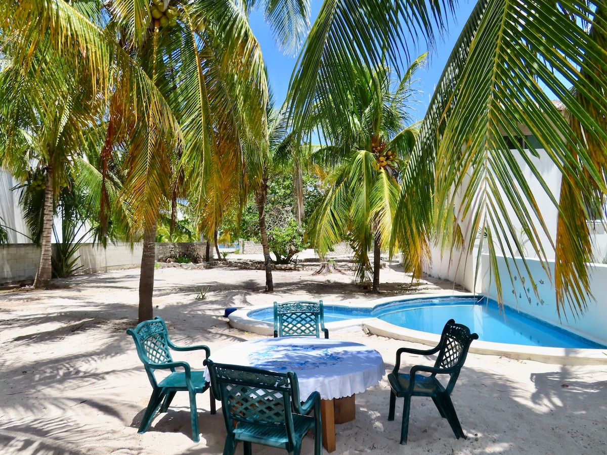 Villa Lujosa décorée vibre « Tulum » avec des finitions et des meubles de luxe. Parfaite pour des vacances face à la mer. Profitez de la terrasse et d'une petite piscine pour vous rafraîchir en sortant de la mer. Faites une sieste dans un hamac avec une vue spectaculaire depuis la chambre principale et profitez du son de la nature. Nous ne facturons pas l'énergie électrique et nous avons un générateur d'énergie pour les urgences, de sorte que vous ne serez jamais à court d'énergie et sans climatisation, que nous avons d'ailleurs partout :)