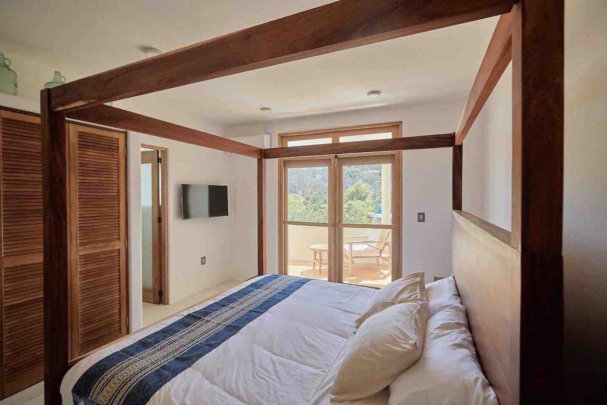 Faites-vous plaisir dans la détente et la tranquillité ultimes de cette escapade unique en son genre. Cette chambre élégante, avec une entrée privée et une salle de bain, offre le cadre idéal pour vous détendre et profiter de la vue imprenable sur la célèbre baie de Playa Estacahuite. Que vous preniez une douche ou que vous vous détendiez sur votre balcon privé, vous pourrez vous imprégner de la beauté naturelle des paysages environnants. Nous offrons également une connexion Internet par satellite Starlink gratuite, afin de vous assurer de rester connecté et de vous divertir pendant votre séjour.